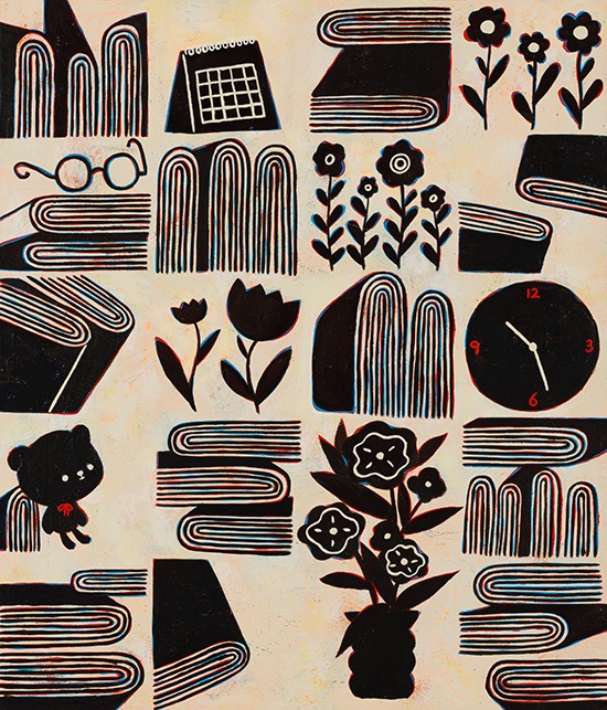 책은 화면을 구성하는 중심 구조이며, 오래된 물건들은 기억의 온도와 흔적을 더합니다. 여기에 금방 시드는 꽃을 더해 짧은 생명의 리듬을 담습니다. 오래된 사물의 깊은 시간과 꽃의 순간성이 서로 대비되며 장면의 호흡을 형성합니다.
