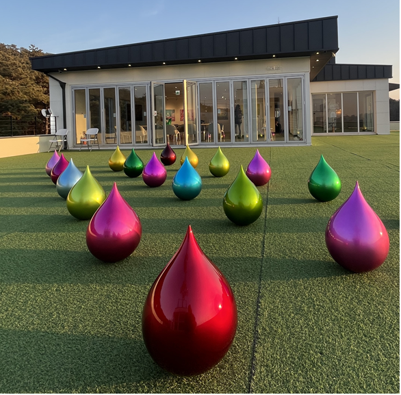 이번 전시는 야외 잔디광장과 실내 전시실을 유기적으로 연결하며, 관객이 하나의 서사 안을 ‘산책하듯’ 이동하도록 구성된 것이 특징이다. 4층 야외 잔디광장에 설치된 「Tears Traveling Theater(눈물 유랑 극장)」는 반사와 굴절을 통해 주변 풍경과 관객을 작품 안으로 끌어들이며, 자연·도시·인간이 한데 겹쳐지는 시각적 장면을 만든다. 실내 제2전시실에서는 미디어아트 영상 「Drops Circus(드롭스 서커스)」 시리즈 4편과 디지털영상 원본작품 디아섹 작품들은 물방울이 시간과 공간을 오가는 존재라는 상상력을 더해, 드롭스가 단일 오브제를 넘어 움직임과 리듬, 빛의 언어로 확장될 수 있음을 보여준다.